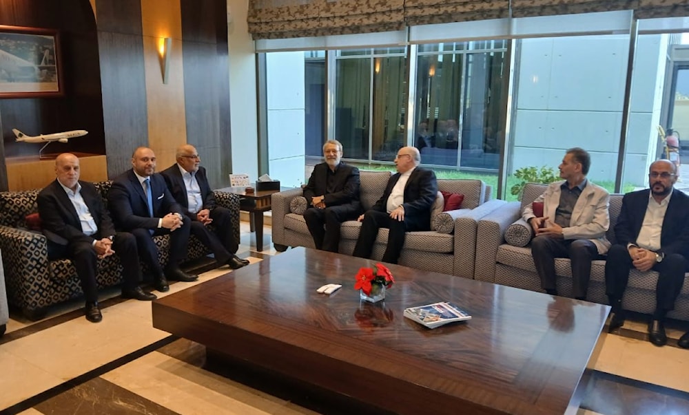 وكان في استقبال لاريجاني، ممثل وزارة الخارجية، وسفير الجمهورية الإسلامية الإيرانية، ووفد من حركة أمل، ومن كتلة الوفاء للمقاومة، وكذلك من حركتي «حماس»، و«الجهاد».