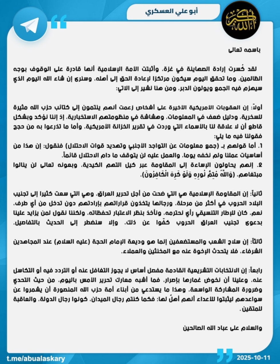 وقال العسكري، في بيان، إن «العقوبات الأميركية الأخيرة على أشخاص زعمت أنهم ينتمون إلى كتائب حزب الله مثيرة للسخرية، ودليل ضعف في المعلومات، وهشاشة في منظومتهم الاستخبارية، إذ إننا نؤكد وبشكل قاطع أن لا علاقة لنا بالأسماء التي وردت في تقرير الخزانة الأميركية».