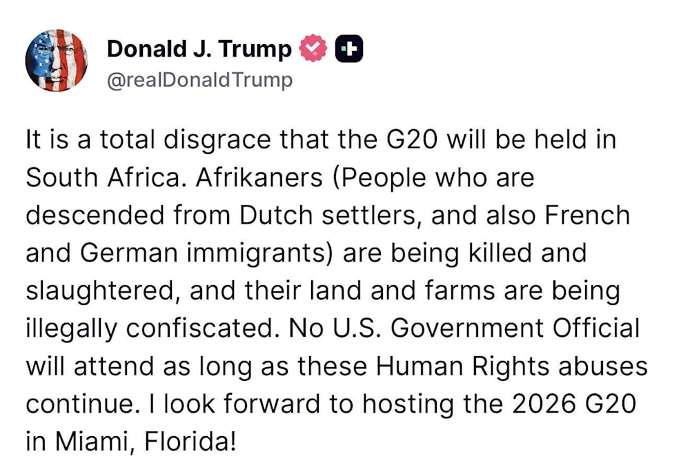 وقال ترامب، في منشورٍ على منصّة «تروث سوشيال»، إنّه «لأمرٌ مُخزٍ تماماً أن تُعقد قمّة مجموعة العشرين في جنوب أفريقيا»، مضيفاً أنّه «لن يحضر أيّ مسؤول حكومي أميركي ما دامت هذه الانتهاكات لحقوق الإنسان مستمرّة».